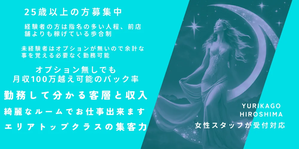 - 『ゆりかご広島』は、女性による女性のための運営を徹底しています。 経験者の方が移籍を決める際、一番不安なのは「人間関係」と「店への信頼」であることを私たちは知っています。移籍にあたっての条件交渉、入店時期の相談、前店でのトラブル相談など、何でもお話しください。私たちは、あなたの「味方」です。