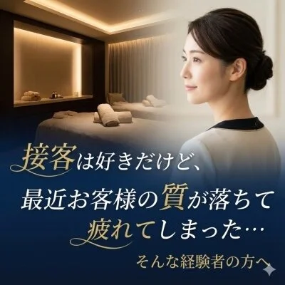 - 【自慢の女性講師による、優しい研修】 当店の研修担当は女性です。同性だからこそわかる「手の動かし方」や「疲れにくい立ち方」、そして接客のコツまで、あなたのペースに合わせてゆっくりお教えします。 私たちが提供するのは、心からリラックスしていただく「癒やし」の時間。 特別な才能はいりません。「誰かを喜ばせたい」というその気持ちがあれば、技術は後から必ずついてきます。